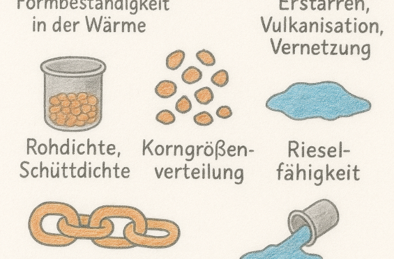 Härte Schlagzähigkeit Viskosität, Schmelzindex Feuchtigkeit Rohdichte, Schüttdichte Korngrößenverteilung, Rieselfähigkeit Formbeständigkeit in der Wärme Zug-, Druck-, Scherfestigkeit Erstarren, Vulkanisation, Vernetzung